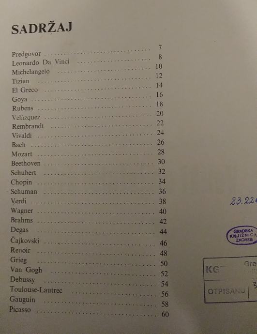 Iz sadržaja: Leonardo Da Vinci, Michelangelo, Tizian, El Greco, Goya, Rubens, Velazquez, Vivaldi, Bach, Mozart, Beethoven, Schubert, Chopin, Schuman, Verdi, Wagner, Brahms, Degas, Čajkovski, Renoir, Grieg, Van Gogh, Debussy, Toulouse-Lautrec, Gauguin, Picasso