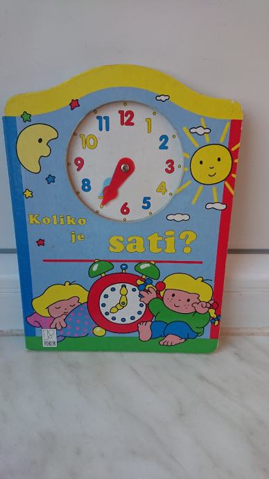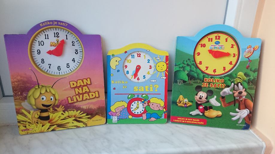 Slikovnice za učenje na sat, lot od tri slikovnice, svaka ima sat sa pomičnim kazaljkama.