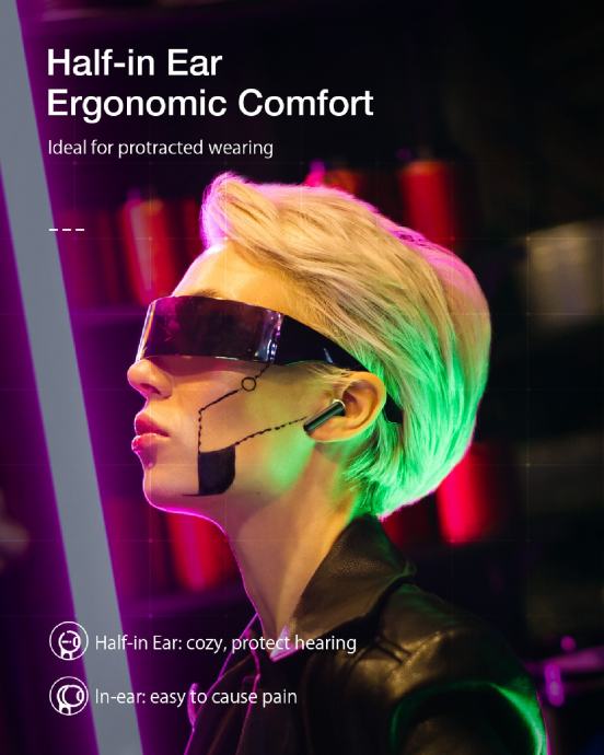Half-in Ear Ergonomic Comfort-- Ideal for protracted wearing.