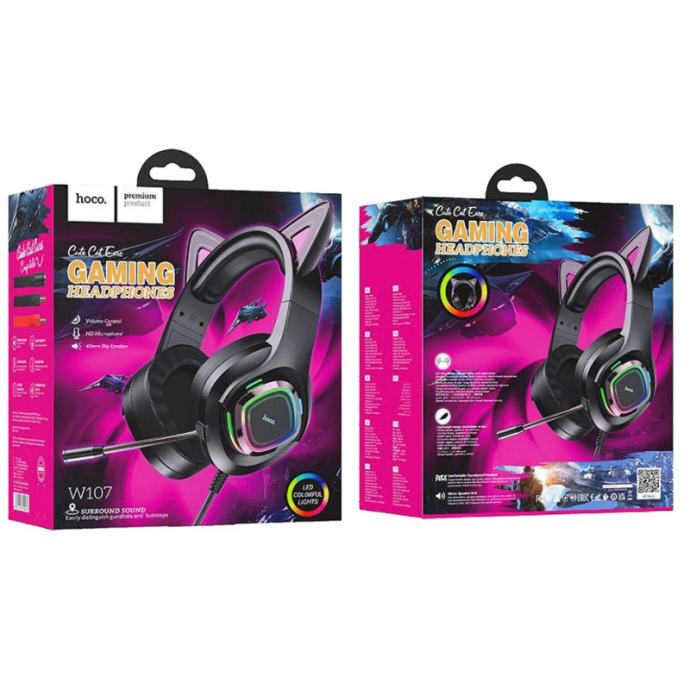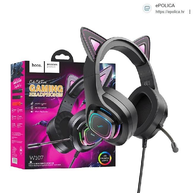 Slušalice HOCO GAMING Cute Cat W107. Savršen dodatak za virtuelne igre. Komplet sa ugrađenim mikrofonom i velikim, udobnim štitnicima za uši omogućava višesatno korištenje, pružajući kvalitetan, čist zvuk bez buke i šuma. Komplet dolazi sa kablom za audio adapter 1na2 koji se može koristiti sa notebook računarima i plavim LED svjetlom.
