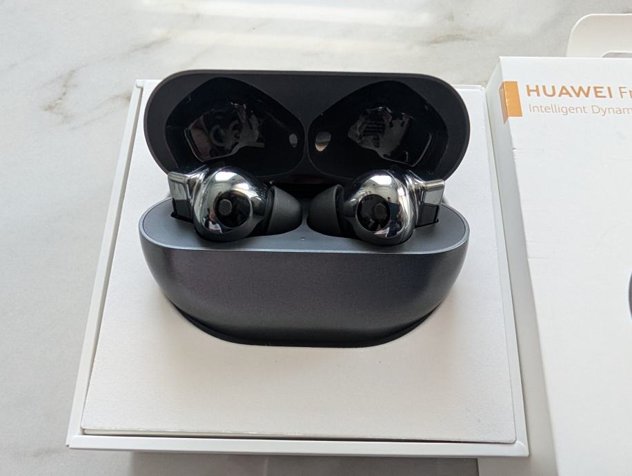 Prodajem rabljene Huawei FreeBuds Pro bežične slušalice s aktivnim poništavanjem buke (ANC). Radi se o modelu u tamnoj, srebrno-crnoj boji, s karakterističnim dizajnom kućišta za punjenje. Slušalice podržavaju Intelligent Dynamic ANC tehnologiju te Voice Mode funkciju. Dolaze s originalnom kutijom.