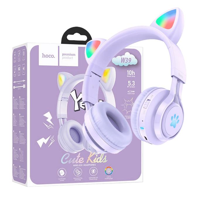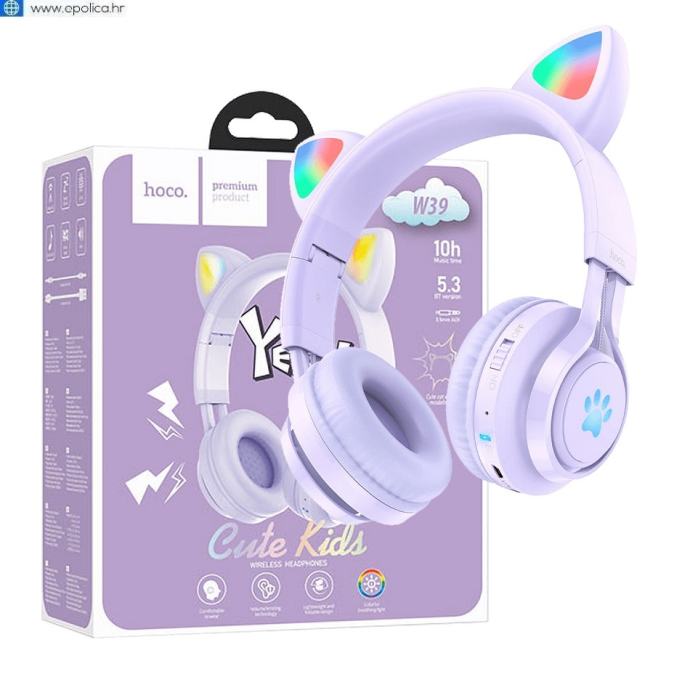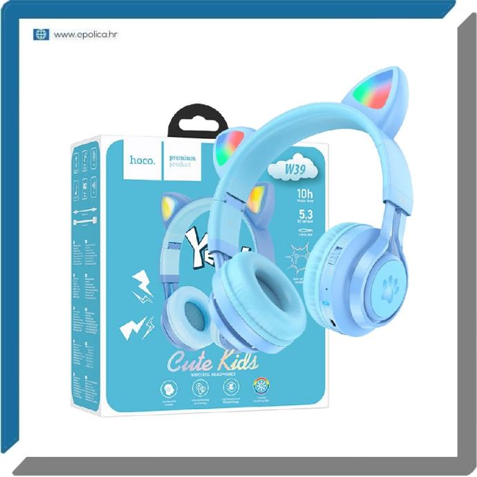 W39 Cat ear bežične slušalice za djecu, BT v5.3, 400mAh baterija za 12 sati korištenja, 120 sati pripravnosti, ograničenje zvuka 85dB, podržava Bluetooth, AUX i druge načine rada.