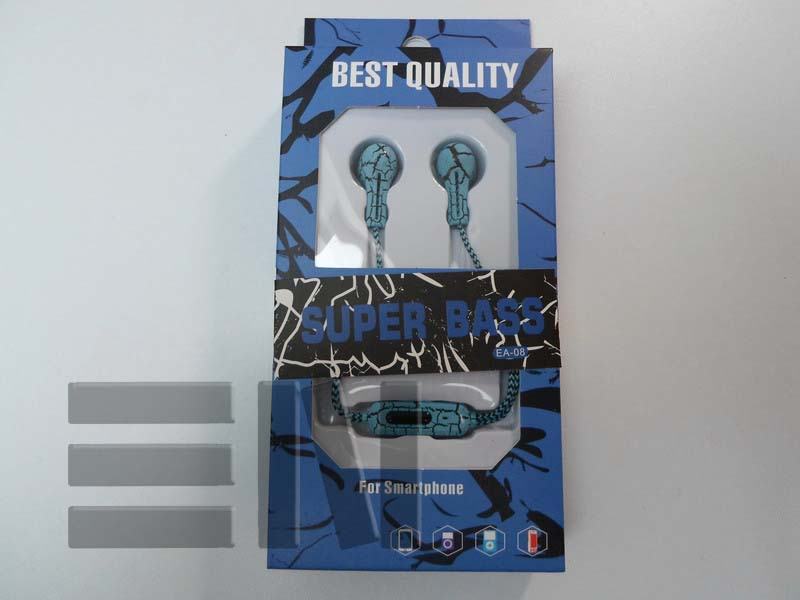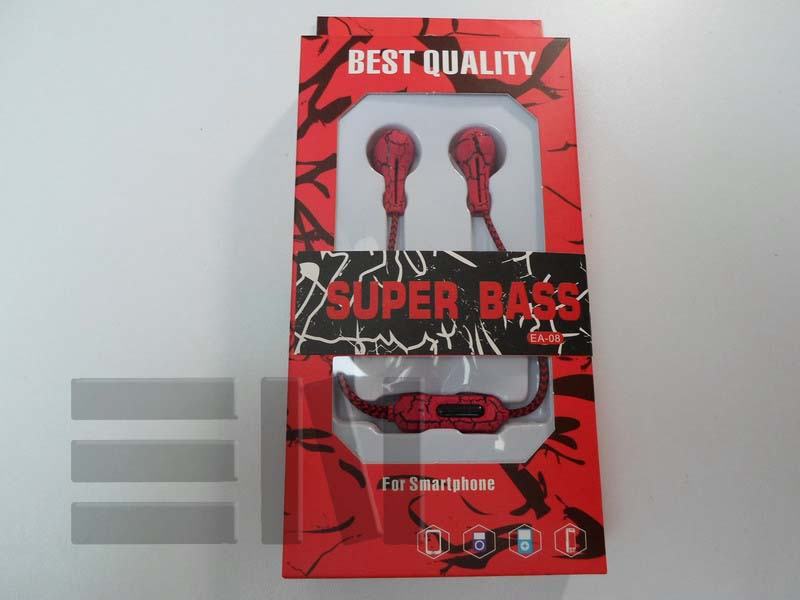 Slušalice EA-08, udobne s mekanim čepićima za uši, dostupne u crvenoj, bijeloj, plavoj, žutoj i crnoj boji, kompatibilne s svim modernim smatphonima i iPhone uređajima sa standardnim 3,5 mm jackom. Kabel kompletno opleten posebnim tekstilom koji poboljšava izdržljivost i smanjuje zaplitanje i uvijanje dužine 1,2m, 13,5 mm neodimijska zvučna jedinica, zatvoreni dinamički sistem, frekvencijski raspon 5 - 24000 Hz.