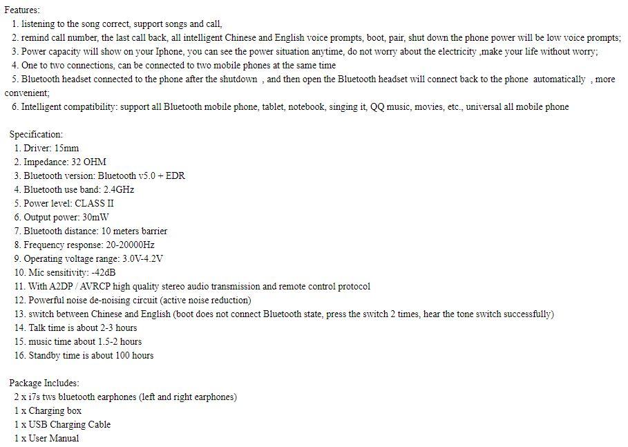 Izuzetan dizajn i lagani volumen pružit će vam bolje iskustvo. Kontrola s više gumba olakšat će vam upotrebu proizvoda. Metalna mreža za prašinu. Metalni zaslon protiv prašine sprječava ulazak prašine u otvor za slušalice. Kvaliteta zvuka jamstvo je naših proizvoda. Surround i glasovno prebacivanje pružit će jamstvo visoke kvalitete poziva. Bluetooth s dvostrukim načinom v4.1, iznimno niska potrošnja energije. Ovaj uređaj može se brzo upariti sa pametnim telefonima, kao i raznim Bluetooth uređajima. Maksimalna udaljenost prijenosa Bluetooth -a 10 metara (30 stopa). Ugrađena litijeva baterija visokih performansi uživajte u oko 4 sata visokokvalitetnog zvuka, u stanju pripravnosti do 120 sati. Sa sučeljem za priključnu stanicu Power Bank za punjenje od 200 mAh, baterija se može brzo napuniti za 80 minuta. Kako spojiti i7s TWS na jedan ili oba uha:- Priključak na jedno uho: Dugo pritisnite višenamjensku tipku i otpustite tipku. Crveno i plavo svjetlo će alternativno bljeskati. Otvorite Bluetooth u telefonu i potražite vezu. Povezivanje s dva uha: Dugo pritisnite višenamjenski gumb i dvaput kliknite s obje strane višenamjenske tipke za ulazak u stanje uparivanja TWS. Pojavit će se odgovarajući ton i pričekati dok ne zasvijetli samo plavo svjetlo koje predstavlja vezu dvaju ušiju. Mini priručnik je uključen u paket.