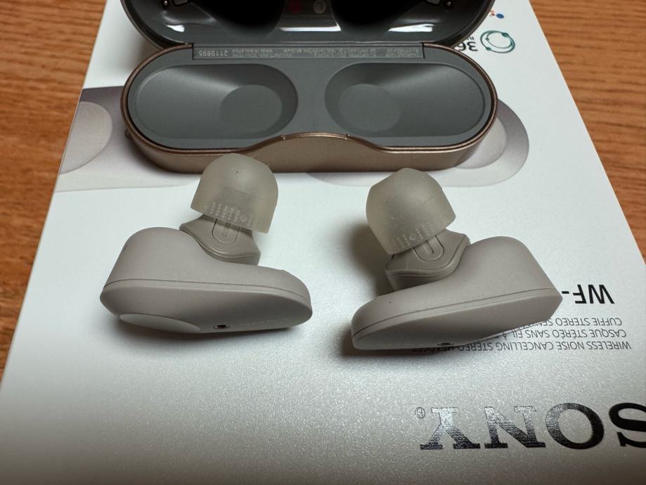 Na prodaju korištene, ali izuzetno očuvane bežične slusalice model Sony WF-1000XM3, u bež boji.