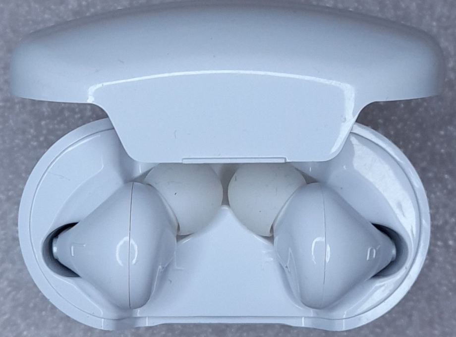 Prodajem nove, nikad korištene TWS (True Wireless) Bluetooth slušalice u bijeloj boji, s kutijicom za punjenje i USB kabelom.