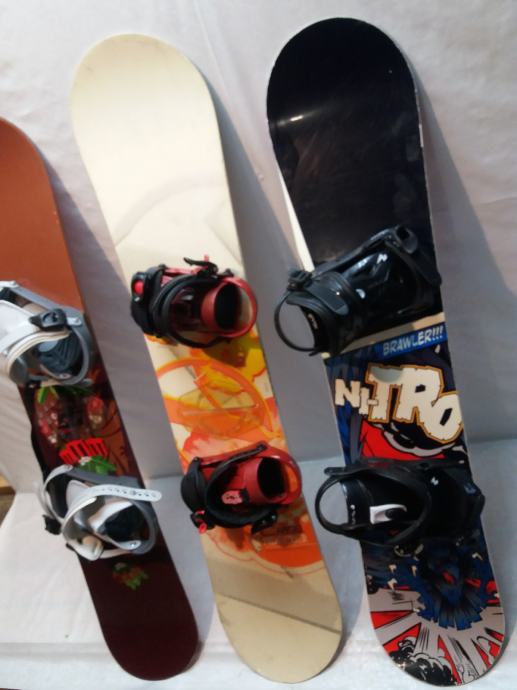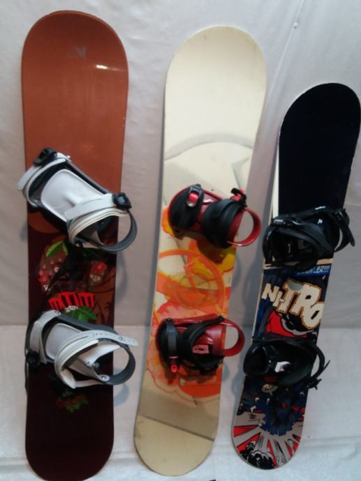 Snowboard sa vezovima 126-133 u dobrom stanju, servisiran. Sa lijeva na desno:1.130cm 100e, 2.133cm120e, 3.126cm 120e.