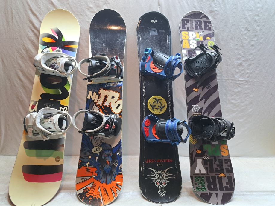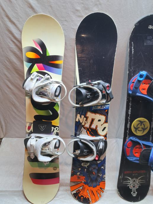 Snowboard sa vezovima u dobrom stanju, servisiran. Cijene (s lijeva na desno):1. 130cm 100e, 2. 132cm 100e, 3. 133cm 80e, 4. 135cm 100e