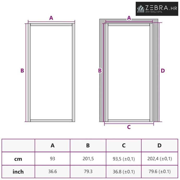 Ova unutarnja vrata trebaju biti montirana u okvir vrata debljine 35 - 50 mm.