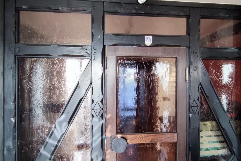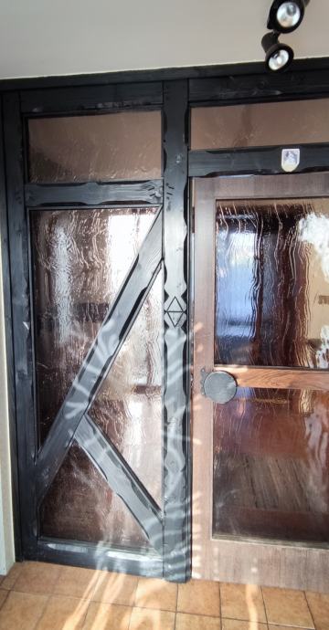 Unutarnja vrata s okvirom tamne boje, masivno drvo s debljim unikatnim staklima. Otvaranje na obje strane (saloon)