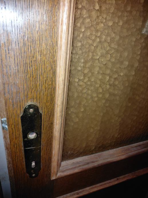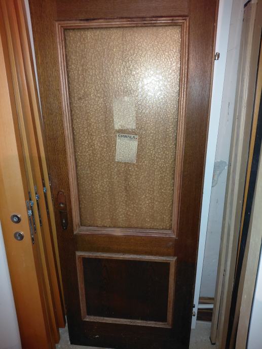Prodajem drvena sobna vrata dimenzija 203×80 cm. Otvaranu se na lijevo. Vrata imaju stakleni umetak u gornjem dijelu s dekorativnim uzorkom, dok je donji dio pun. Drvo je tamnije boje s vidljivom teksturom. Vrata dolaze bez okvira. Kvaka i brava su uključeni.