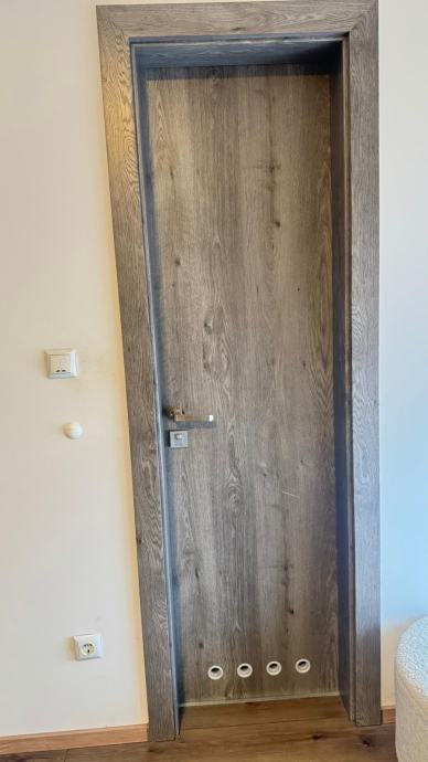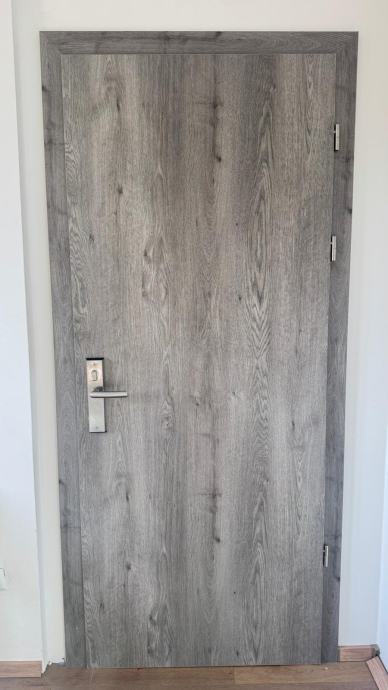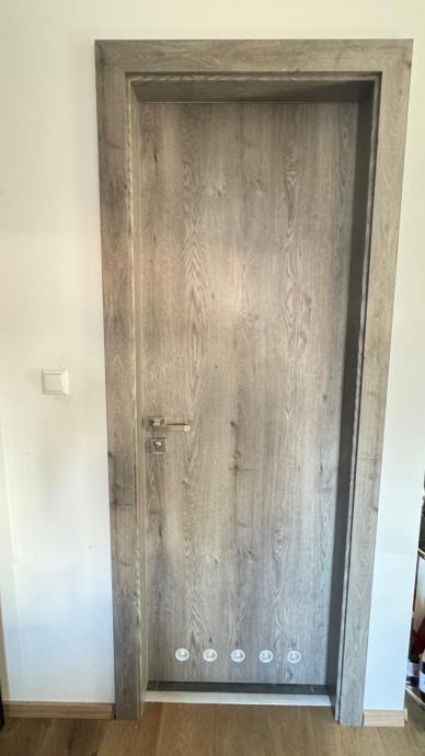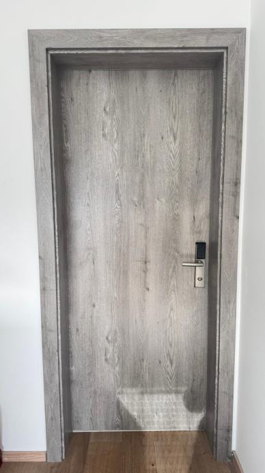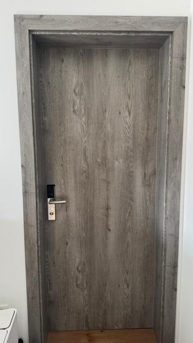 Prodajem sobna vrata sa štokom u sivoj boji s imitacijom drva. Vrata su punih krila, ravnog dizajna bez ukrasa, s metalnom kvakom i bravom. Štok je iste završne obrade kao i krilo vrata, što daje ujednačen izgled. Komplet dolazi s priborom za ugradnju koji je vidljiv na fotografijama.