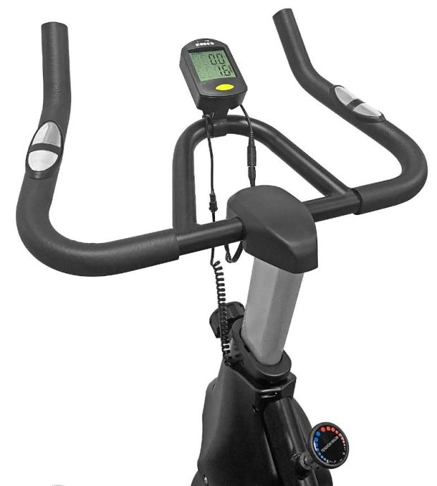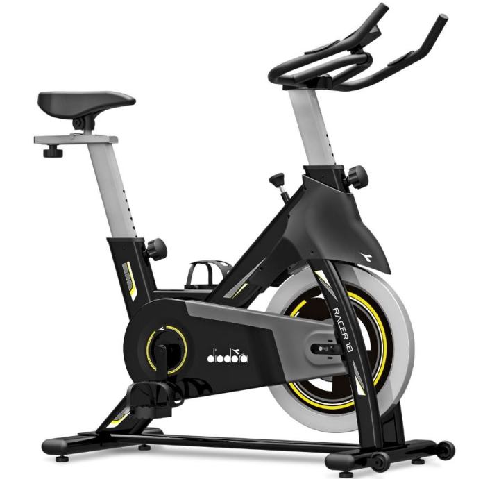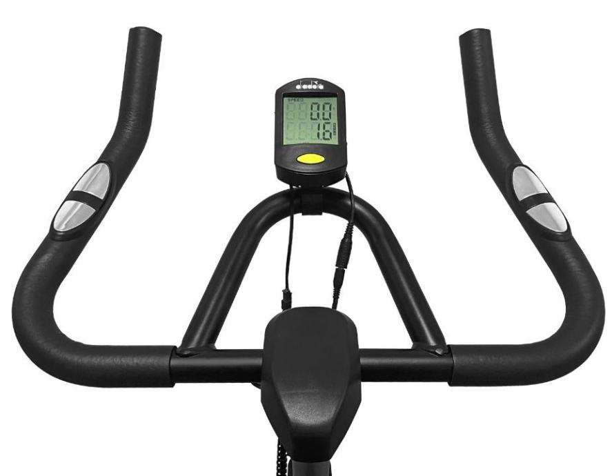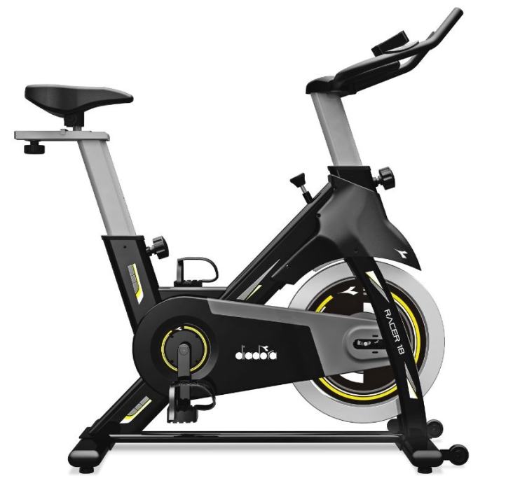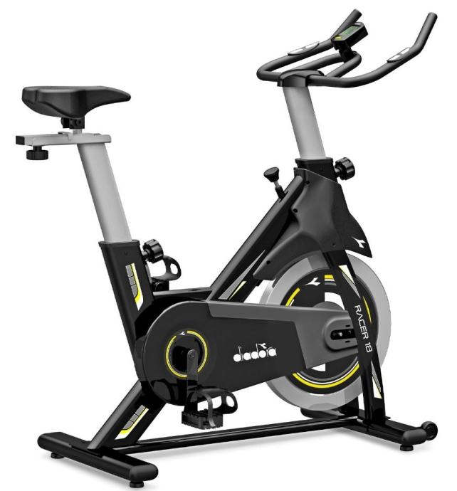 Novi model sobnog bicikla Diadora. Sa zamašnjakom od 18 kg i fiksnim zupčanikom, nudi glatku i realističnu vožnju. Opremljen LCD zaslonom koji prati vrijeme, brzinu, udaljenost, potrošene kalorije i otkucaje srca.LCD zaslon koji prikazuje vrijeme, brzinu, udaljenost, kalorije, pulsRučno podešavanje težine vožnjeSustav remenskog pogonaErgonomske ručkeTrkaće uravnotežene pedaleSustav kočenja preko kočione ploče na vrhu kotačaUdobno sjedalo koje se može namjestiti okomito i vodoravnoVertikalno podešavanje kormilaKotači za lakše kretanjeMehanizam za izravnavanje na neravnom terenuMaksimalna težina korisnika: 120 kgDimenzije montiranog bicikla: 113,5 x 48 x 115,9 cmDimenzije pakiranja: 101 x 19 x 76,5 cmTežina: 34 kg