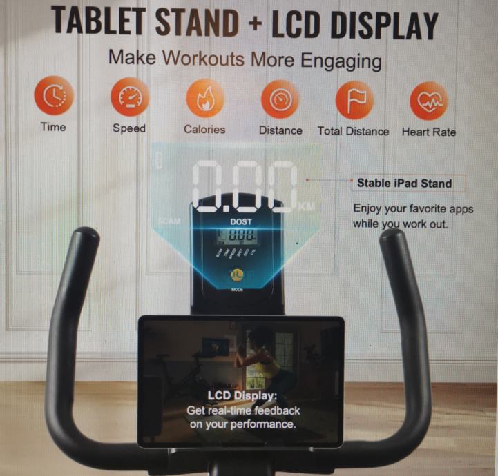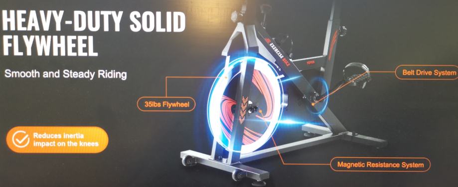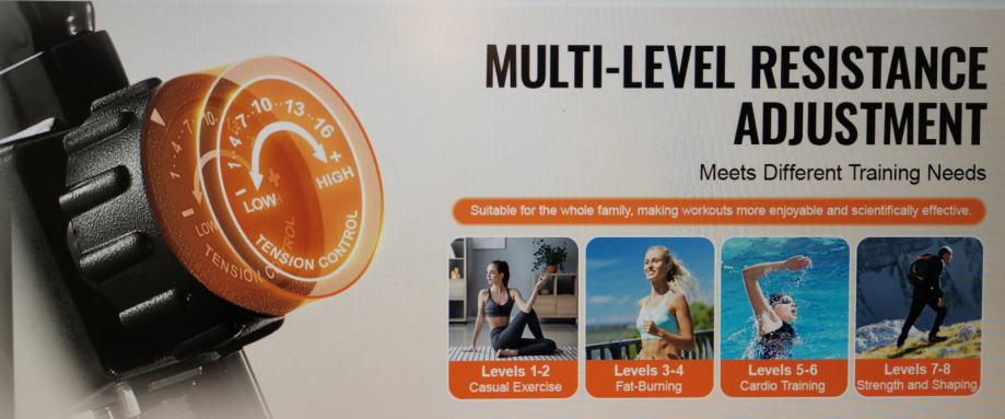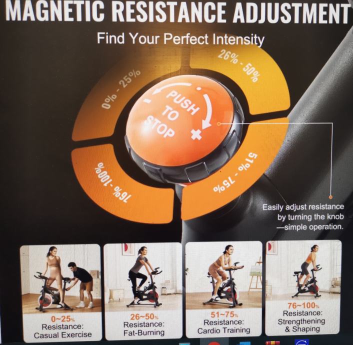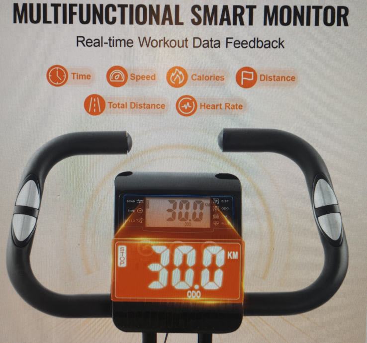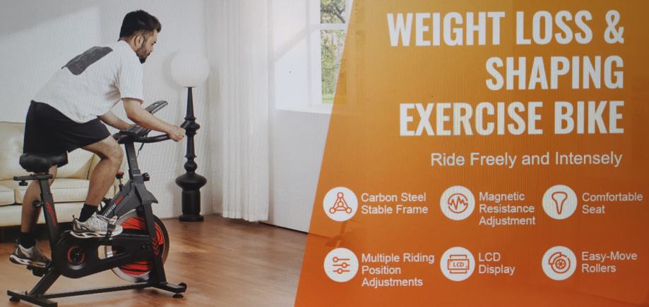03. Ovaj sobni bicikl je za osobe do 110 kg. Ima magnetni otpor (kocnicu) i to na 8 razina, sto znaci da je vrtnja pedala fluidna, bez ikakvih preskakanja. Ima i podesivo sjedalo, kao i ugrađeno računalo s ekranom koje prikazuje rezultate 4 funkcije (vrijeme, trajanje vježbe, trenutna brzina, preračunatu udaljenost u vježbi i približno utrošen broj kalorija). Brojke na ekranu su poprilicno velike.....