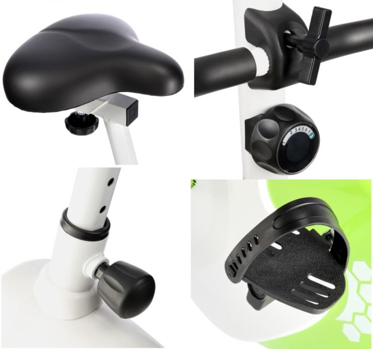 Sobni bicikl s tihim magnetskim sustavom za vježbanje, sjedalom podesivim okomito i vodoravno, mjeračem otkucaja srca i kotačima za jednostavno pomicanje. Izvrstan za dnevni kardio!Udaljenost od sjedala do pedala: 720-900 mmUdaljenost od sjedala do poda: 81-100 cmKotači za pomicanjeZamašnjak: 9 kgPodesivi rukohvat8 razina otporaPodesivo sjedalo vodoravno i okomitoLCD zaslon prikazuje vrijeme, brzinu, udaljenost, broj otkucaja srca, kalorijeVeličina: 93 x 54 x 138 cmDopuštena težina: 120 kg