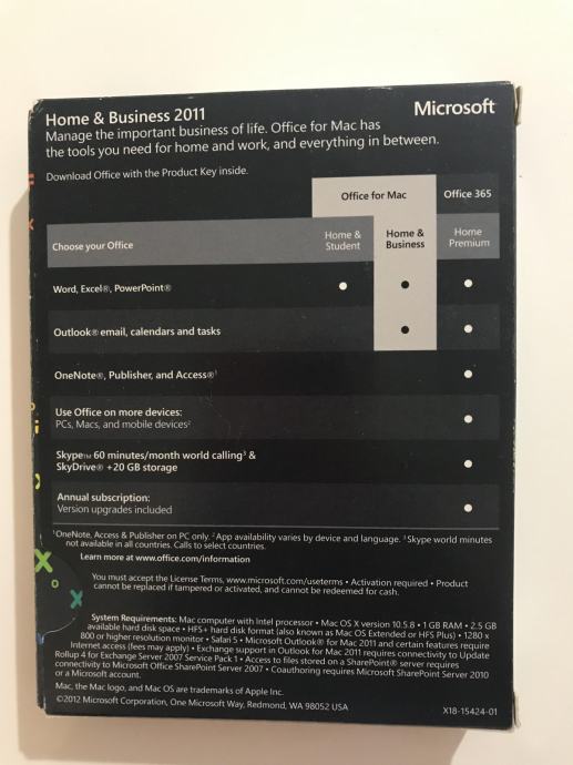 Microsoft Office 2011 za Mac; one-time payment, lifetime licenca.