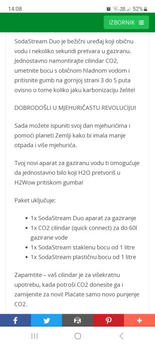 Prodajem aparat za mineralnu,sokove može proizvest za par sekundi. Prodajem ga zato što ne koristimo. Par puta korišten. Dajem bocu uz njega i 2 punjenja koja treba samo napunit.jednostavno rukovanje. Skupo plačeno.