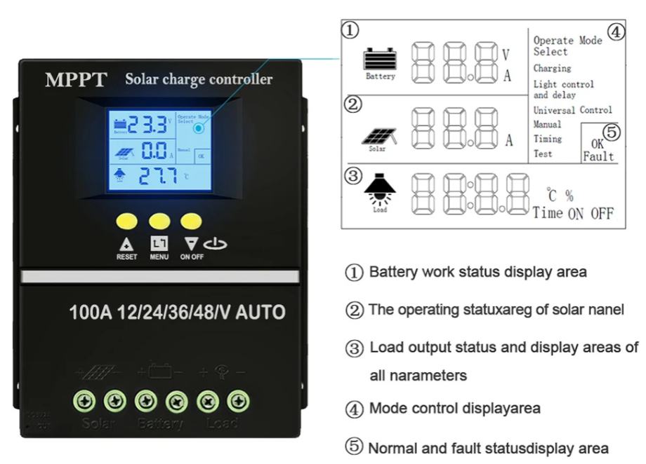 10. Prikaz parametara kontrolera (način rada, napon baterije, struja punjenja PV-a, struja pražnjenja baterije, radna temperatura proizvoda, vrijeme odgode).