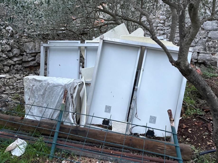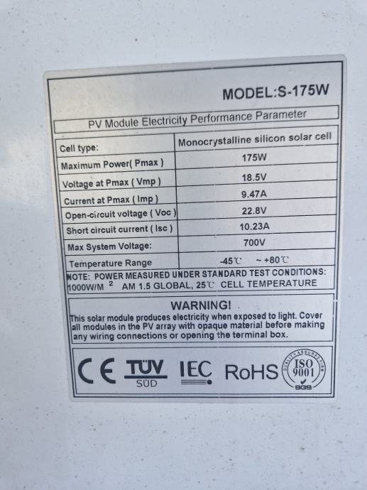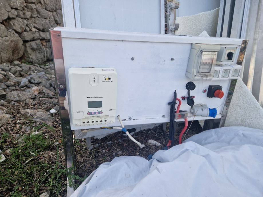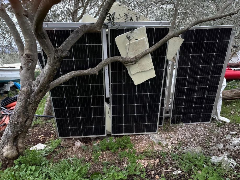 9 solarnih panela na alumijskim okvirima. Paneli su podijeljeni na 4 aluminijska okvira, 3x2 i 1x3. Uz to ide i ormarić za priključenje na 220V.