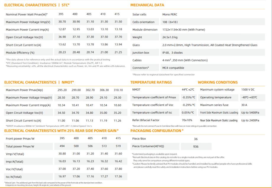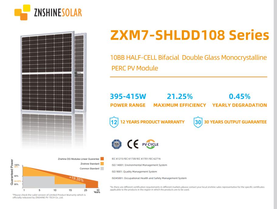 Solarni paneli ZNSHINE ZXM7-SHLDD108 410W potpuno crni, Bifacial (staklo s obje strane). Dostupno 24 komada. Popust na veću količinu ili kupnju svih zajedno.