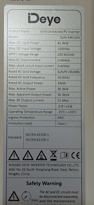 Deye SUN-33K-G04 je trofazni string inverter snage 33 kW, namijenjen za komercijalne i industrijske fotonaponske sustave. Ovaj model kombinira visoku učinkovitost, fleksibilnost u dizajnu sustava i napredne sigurnosne značajke, čineći ga pouzdanim izborom za različite PV instalacije.