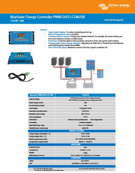 Victron DUO 20A PWM je pouzdan solarni regulator punjenja dizajniran za istovremeno punjenje dvije odvojene baterije (npr. starter baterija i servisna baterija) iz istog solarog panela. Ovaj regulator idealan je za korištenje u kamperima, čamcima i off-grid sustavima gdje je potrebno automatski održavati dvije baterije.