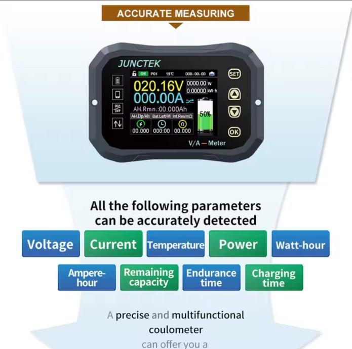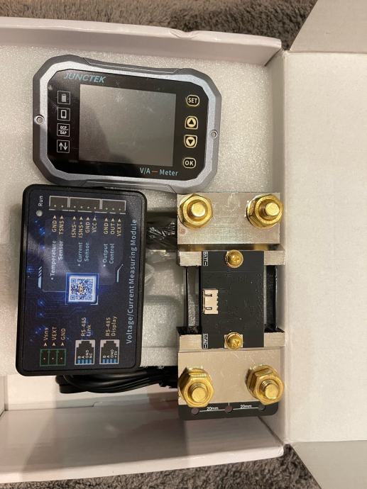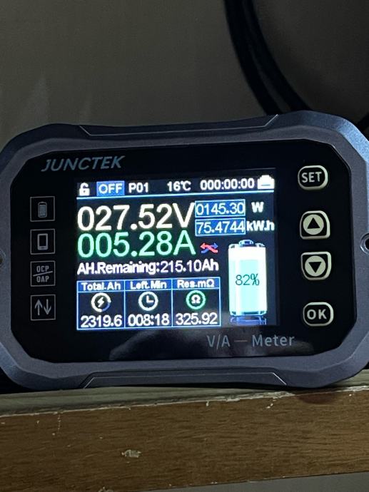 Prikaz napona baterija, ulazne snage u amperima, izlazne potrosnje, postotak baterije i kolicina ampera, sonda za temperaturu baterije