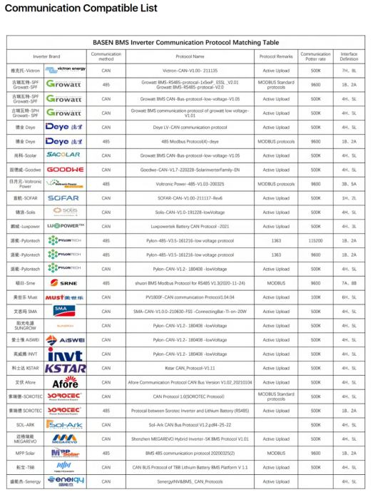Baterije mogu u paralelu do 16 komada, te imaju kompatibilne komunikacijske protokole sa većinom invertera (vidi sliku za detaljnu listu).