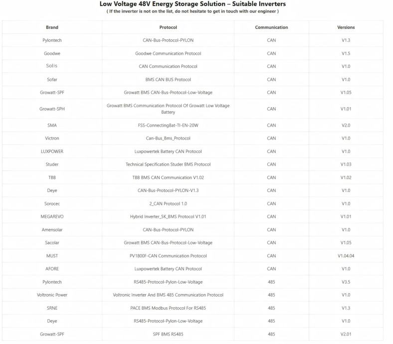 Baterije mogu u paralelu do 16 komada, te imaju kompatibilne komunikacijske protokole sa većinom invertera (vidi sliku za detaljnu listu).