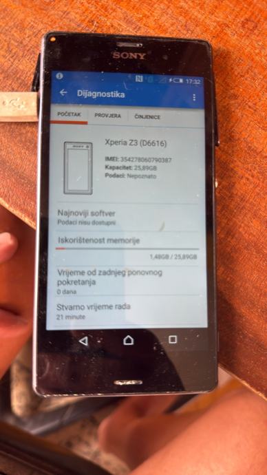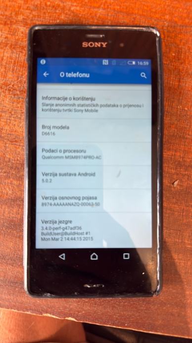 Prodajem rabljeni Sony Xperia Z3 mobitel koji je još uvijek u funkcionalnom stanju. Uređaj ima standardne aplikacije i može se vidjeti da radi ispravno, kao što pokazuju dijagnostički podaci. Crne je boje s karakterističnim Sony dizajnom, očuvan i spreman za novog vlasnika.