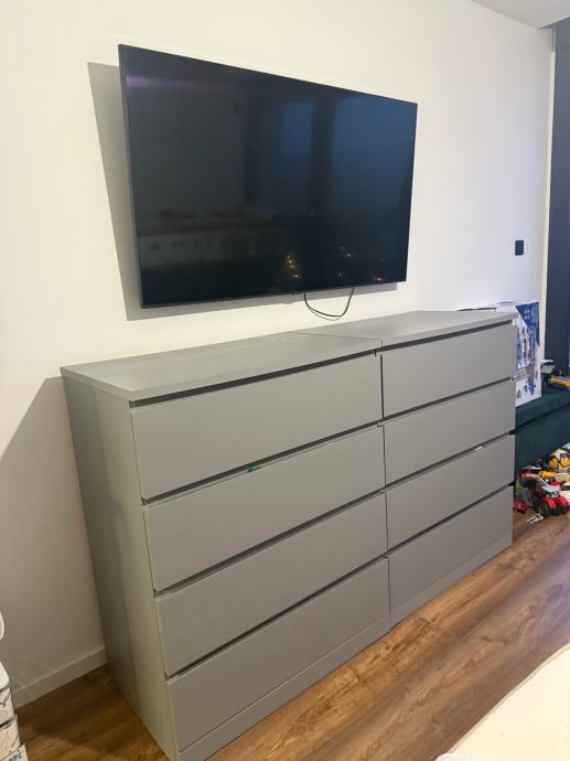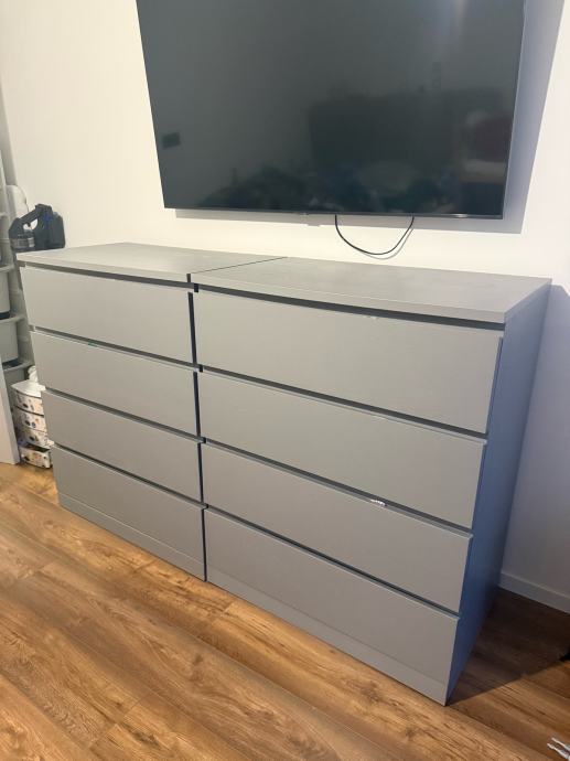 Prodajem dvije Ikea komode MALM u sivoj boji. Svaka komoda ima 4 ladice, što ukupno daje 8 ladica za odlaganje. Komode su postavljene jedna do druge i zajedno izgledaju kao jedna veća komoda, pa su praktične i za manje i za veće prostore.