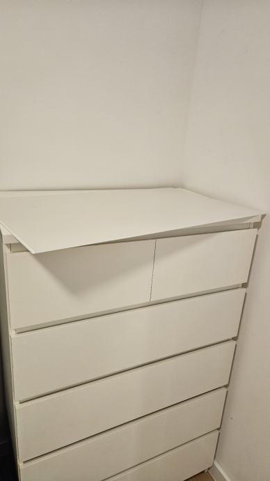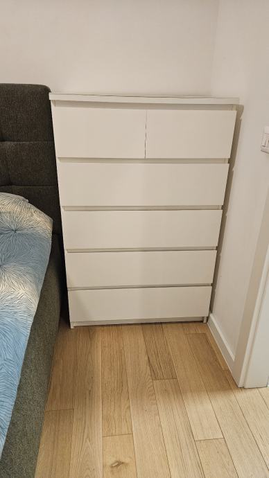 Ikea malm komoda sa 6 ladica ( gornja je podijeljena u dva dijela). Komoda dolazi u kompletu sa staklenom površinom koja se odvojeno kupuje. Korišteno, ali u dobrom stanju. Komoda je složena i tako se prodaje. Potrebno spustiti i sa prvog kata zgrade koja ima lift.