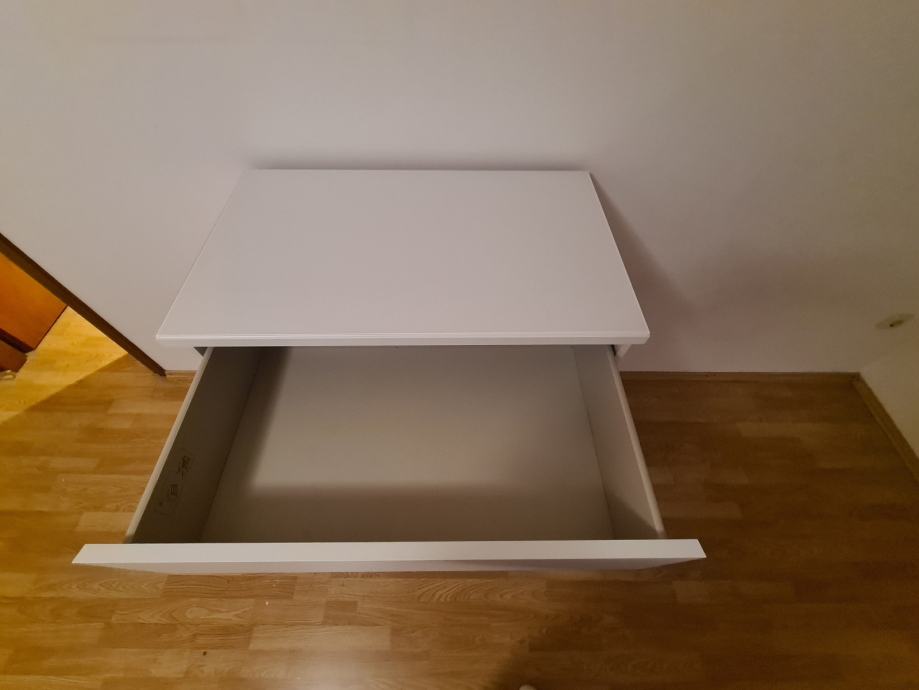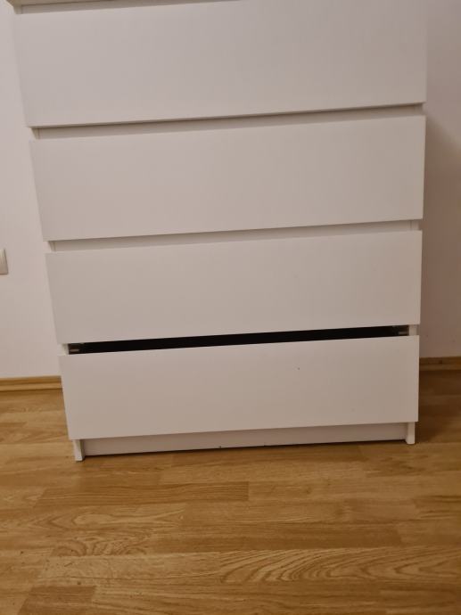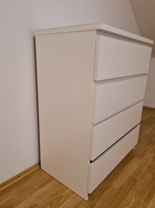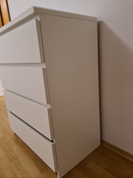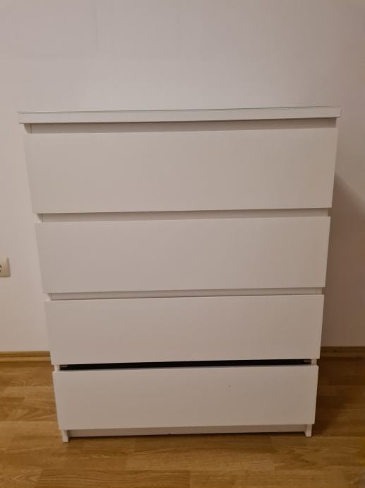 Komoda s 4 ladice, bijela boja, 80x100 cm. IKEA model: MALM. Iznad zadnje ladice nedostaje letvica (priložena fotografija). Bez drugih oštećenja, u dobrom stanju. Površina komode pokrivena bijelim mliječnim staklom; lakše održavanje (priložena fotografija). Dimenzije - š:80 cm, d:48 cm i v:100 cm. Vlastiti prijevoz. Upit porukom ili email: anazilla02@gmail.com