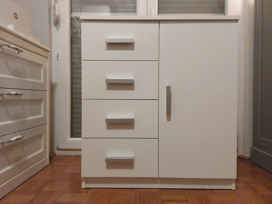 Prodajem komodu (četiri ladice + jedna polica iza vrata) u izvrsno očuvanom stanju, već sastavljenu i bez ikakvih vidljivih oštećenja.