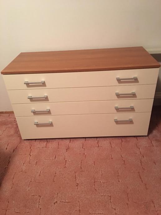 Prodajem komodu s četiri prostrane ladice. Ladice komode su u Krem boji, a gornja ploča u prirodnoj smeđoj nijansi drva. Ladice imaju metalične ručke te se lako otvaraju i zatvaraju. Solidna je i stabilna, pruža dosta prostora za pohranu odjeće i drugih stvari.