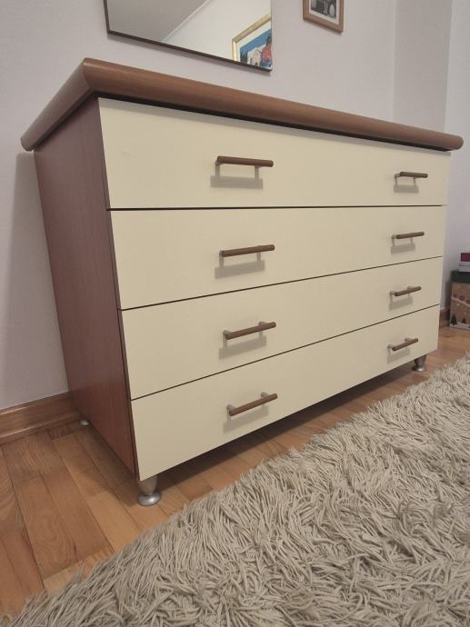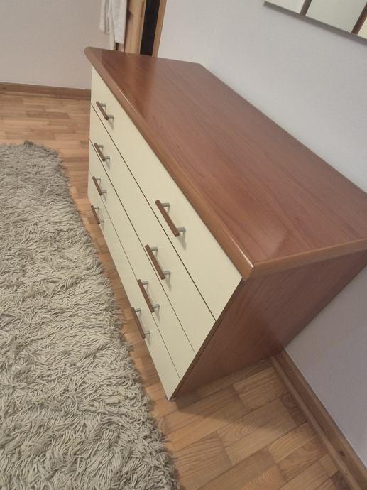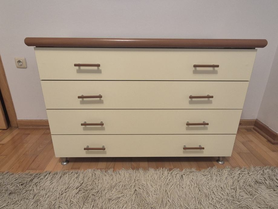 Prodajem komodu s četiri ladice, kremasto bijele boje s drvenim gornjim dijelom i bočnim stranicama u toplijoj smeđoj nijansi.