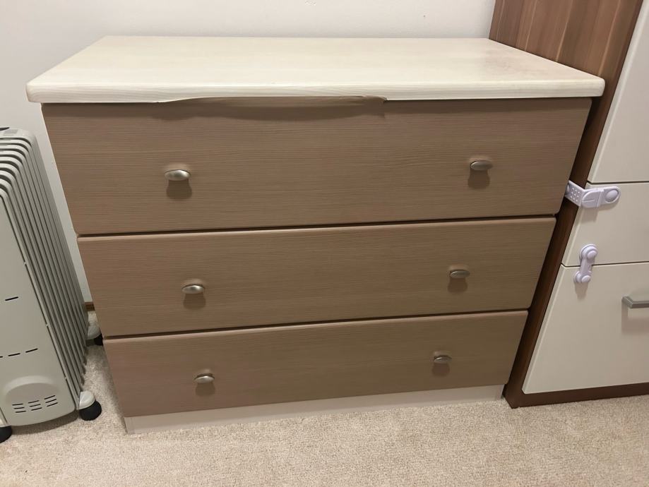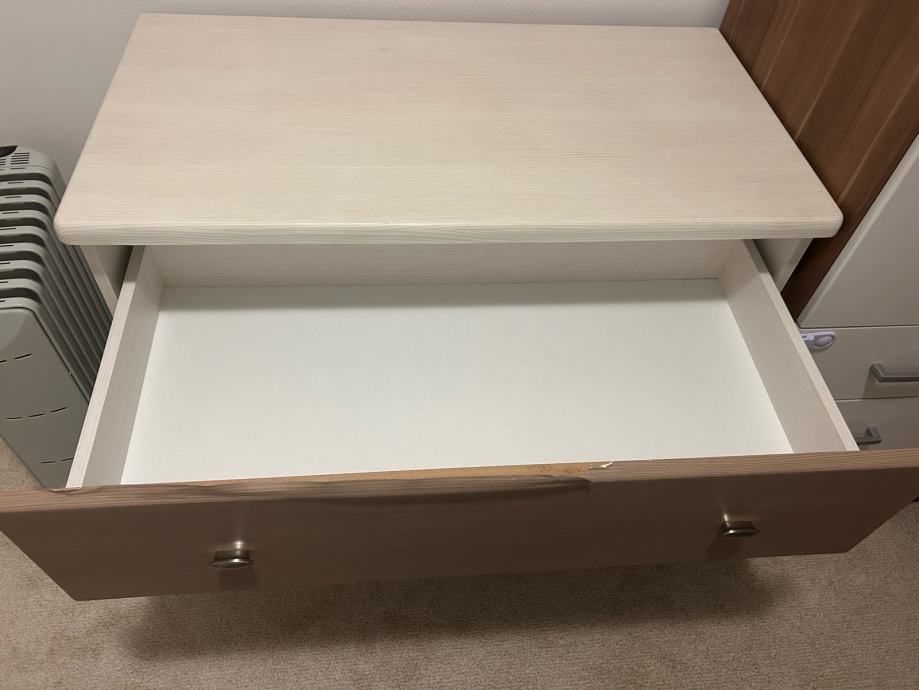 Prodajem komodu za spavaću sobu. Komoda je očuvana i funkcionalna, sa manjim estetskim oštećenjem – na gornjoj strani kod prve ladice vidi se trag gde se nalepnica odlijepila (vidljivo na slici).