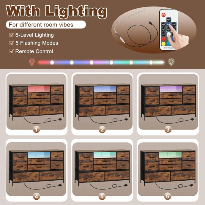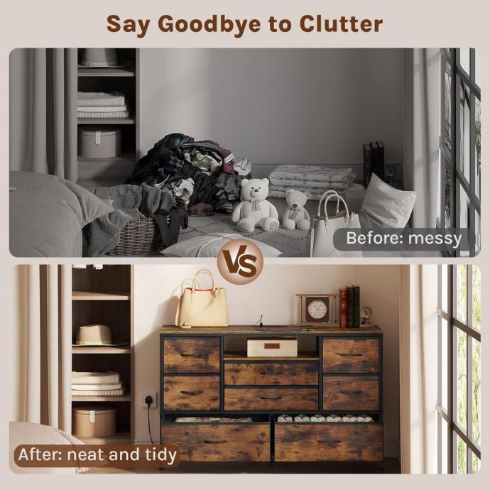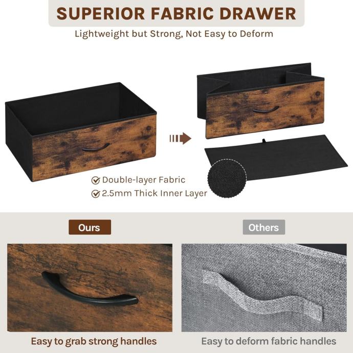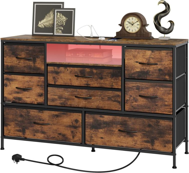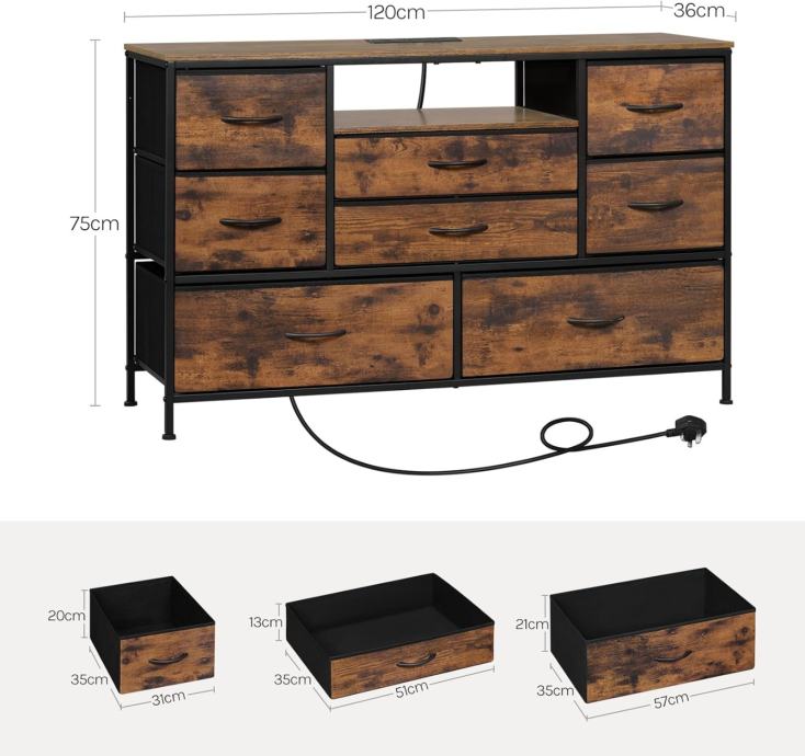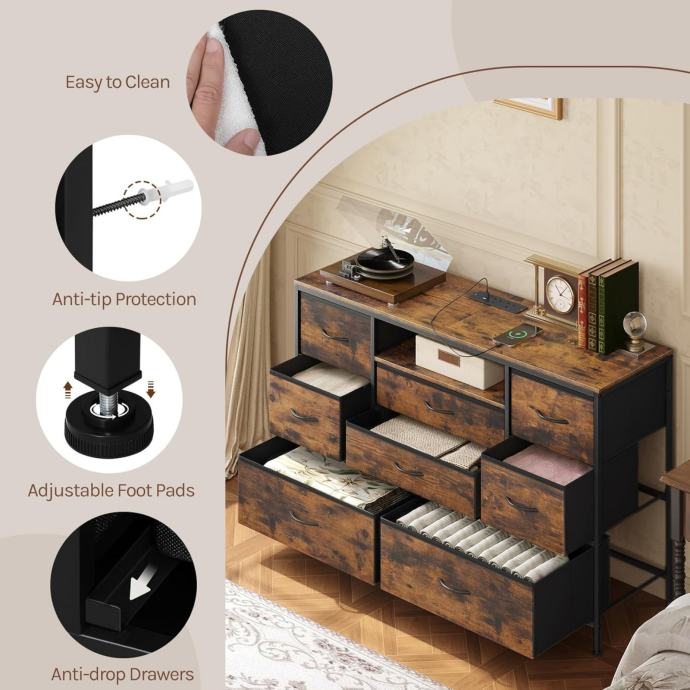 Čvrsti metalni okvir i rustikalni dizajn: Okvir od teškog čelika + drveni vrh s FSC certifikatom; uključen je komplet protiv prevrtanja. Rustikalna smeđa završna obrada nadopunjuje uređenje spavaće sobe i dnevnog boravka.