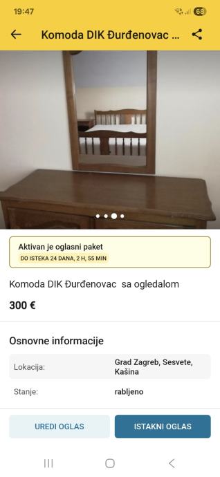 Prodajem lot koji uključuje komodu i ogledalo, izrađene od drva u smeđoj, prirodnoj boji. Komoda je masivne izrade s ukrasnim rezbarenim detaljima na vratima i ladicama te crnim metalnim ručkama u rustikalnom stilu. Ima nekoliko ladica s lijeve strane i dva veća odjeljka s vratima, što pruža dosta prostora za odlaganje. Ogledalo je pravokutnog oblika s drvenim okvirom koji se stilski podudara s komodom.