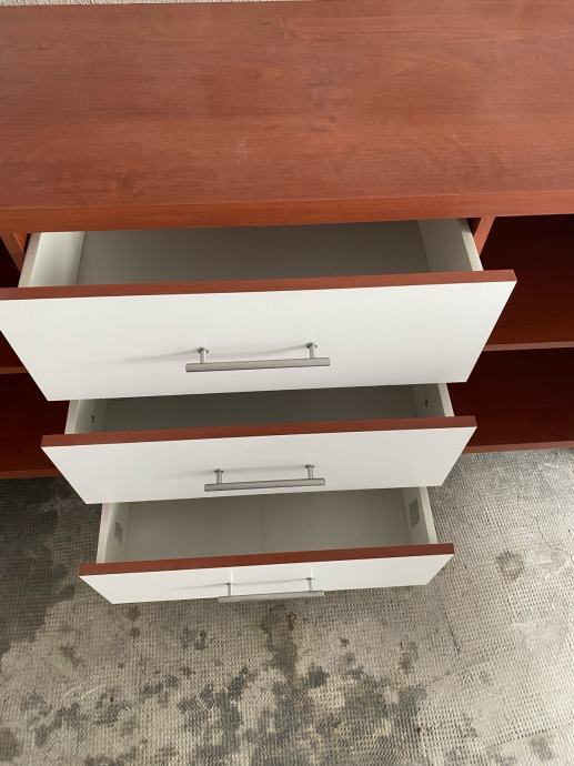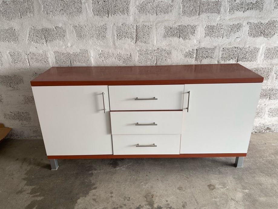 Ova moderna komoda izrađena je od kvalitetnih materijala, s kombinacijom bijelih i smeđih elemenata koji unose toplinu i stil u svaki prostor. Središnji dio komode sadrži tri prostrane ladice sa srebrnim ručkama, dok bočne strane imaju vrata iza kojih se nalaze po dvije police za organiziranu pohranu. Jednostavan i funkcionalan dizajn upotpunjen je metalnim nogama koje pružaju dodatnu stabilnost i moderan dojam.