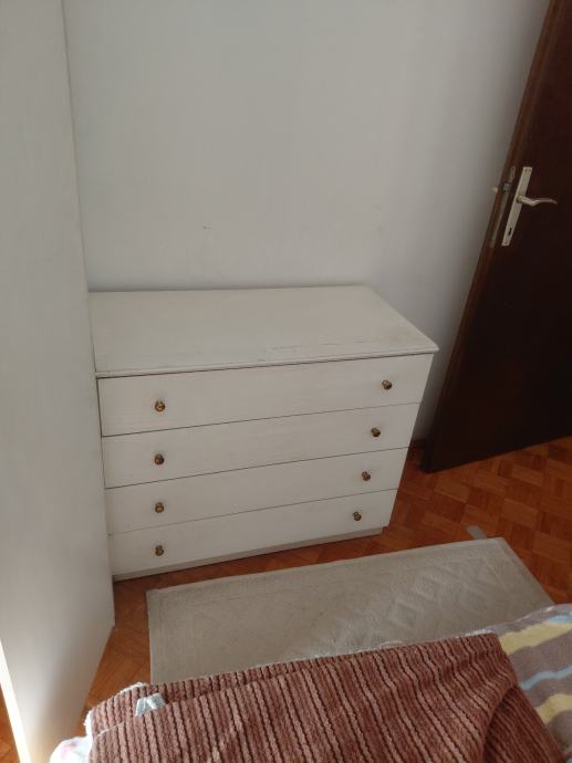 Prodajem ormar i komodu u bijeloj boji. Ormar ima vrata sa staklenim umetcima u rešetkastom uzorku te unutarnji prostor s policama i šipkom za vješanje odjeće. Komoda ima četiri prostrane ladice s okruglim ručkicama. Oba komada namještaja su u bijeloj boji pa se lijepo uklapaju jedan uz drugi.te radni stol.Sve treba dobru volju za čišćenje
