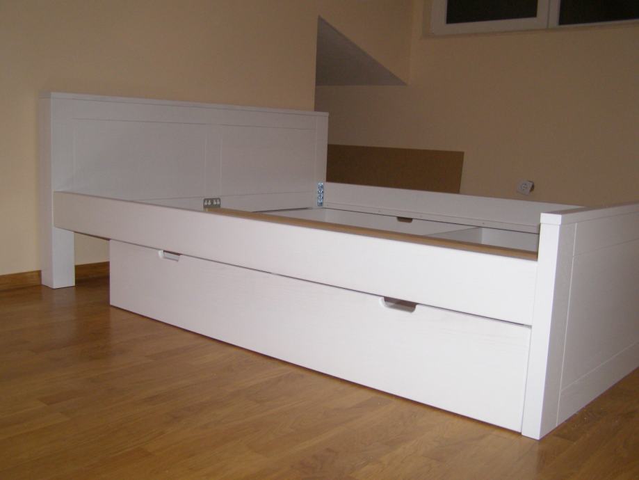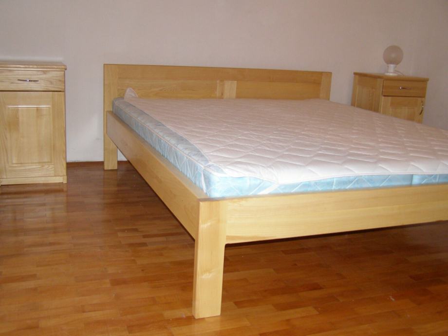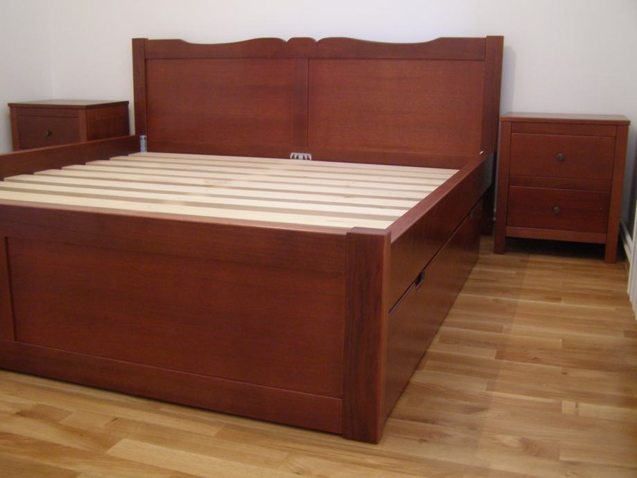 Bračni drveni masivni krevet lakiran pur lakom vidljive strukture hrastovog goda. Ladice su u cijelosti drvene, pomiču se pomoću kotača.Moguća kupnja bez ladica i podnica .mob 098 313197