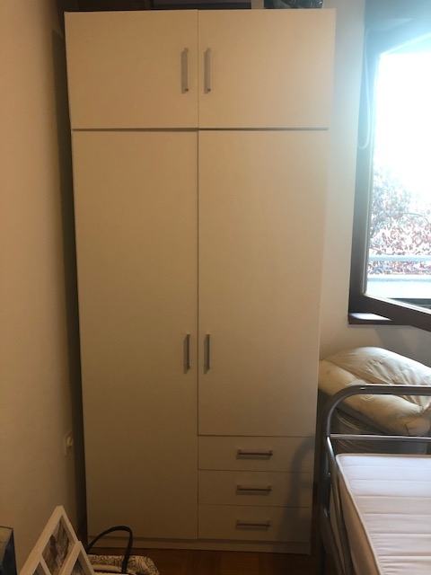 Bijeli garderobni ormar u jako dobrom stanju , kao nov, kupljen u prosincu 2019. Dimenzije; Širina: 96 cm, Visina: 176 cm, Dubina: 50 cm. Ukrasni furnir. Unutrašnjost ormara: 3 police i 1 šipka za vješalice. Na ormaru je i gornji ormarić Širina: 96 cm, Visina: 41 cm, Dubina: 50 cm iz iste kolekcije.