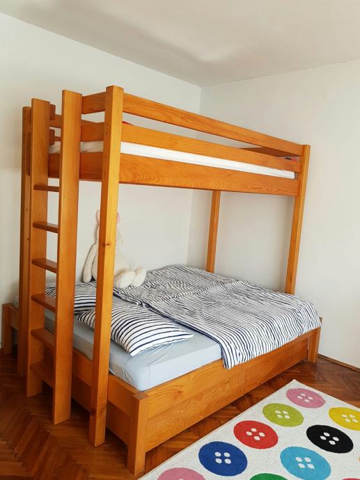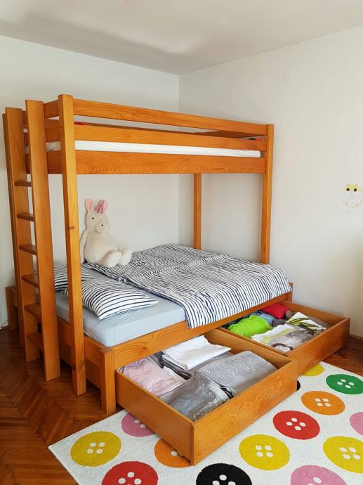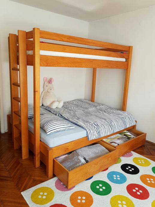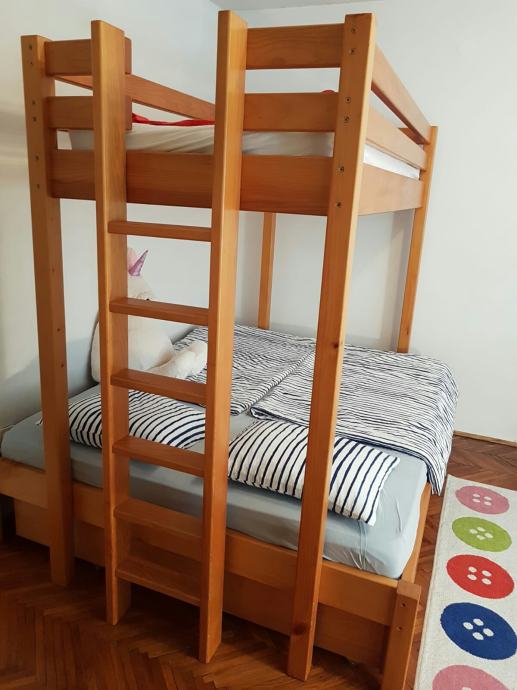 Iznimno kvalitetan krevet od punog drveta. Ručni rad. Dimenzije 160×200 donji, a 90×200 gornji krevet.