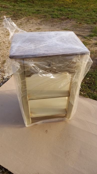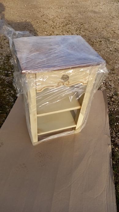 Lakirano u 2 boje..dolnji diio je lakiran u vanilija sa smečkastom patinom a gornja ploca je lakirana na nacin da se uklopi sa tom patinom...u orah isto kao i vijenac ormara