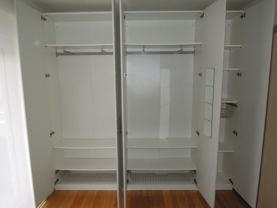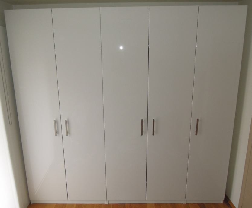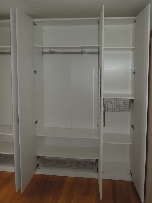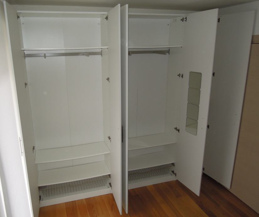 Prodajem garderobni ormar IKEA PAX u odličnom stanju, korišten manje od godine dana. Ukupne dimenzije (š) 250 x (v) 236 x (d) 37 cm, dakle 2 x (100 x 236 x 37 cm) i 1 x (50 x 236 x 37 cm). Ormari bijela mat boja, vrata sjajni bijeli lak, ručke brušeni inox. Ormar se može kompletno rastavit a nalazi se u Ičićima (Opatija). Moguče postavit kao komplet ili samostalne segmente - 100 x 236 x 37 cm (2x) i 50 x 236 x 37 cm (1x). Cijena 4 600 KN (600 EUR).