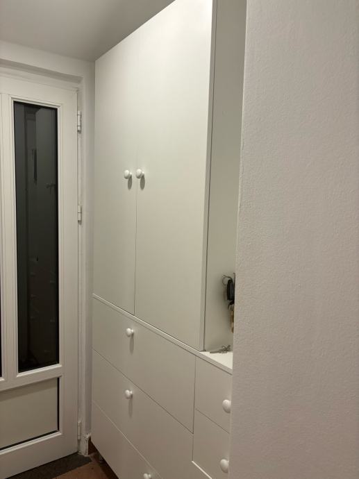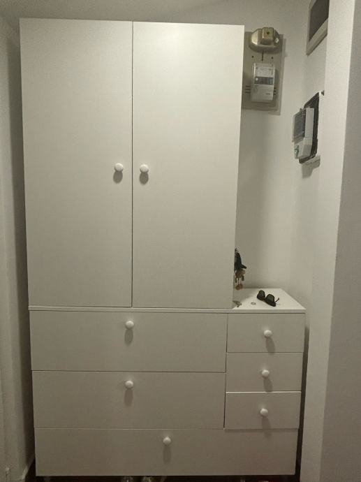 Bijeli ormar s policama i na desno ladicama. Dimenzije dubina 33 cm