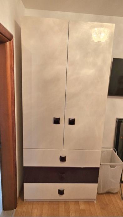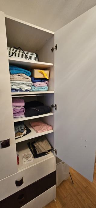 Prodajem dizajnerski garderobni ormar s 3 ladice. Ormar ima dvokrilna vrata s tamnim ručkama te 3 ladice u donjem dijelu, od kojih su dvije u bijeloj boji, a jedna u tamnijoj boji patliđana. Unutrašnjost ormara opremljena je s nekoliko polica koje pružaju dovoljan prostor za odlaganje odjeće i ostalih potrepština. Kombinacija bijele i boje patliđana daje mu moderan, dizajnerski izgled koji se uklapa u različite uređaje spavaće ili dječje sobe.