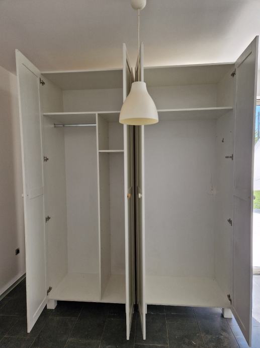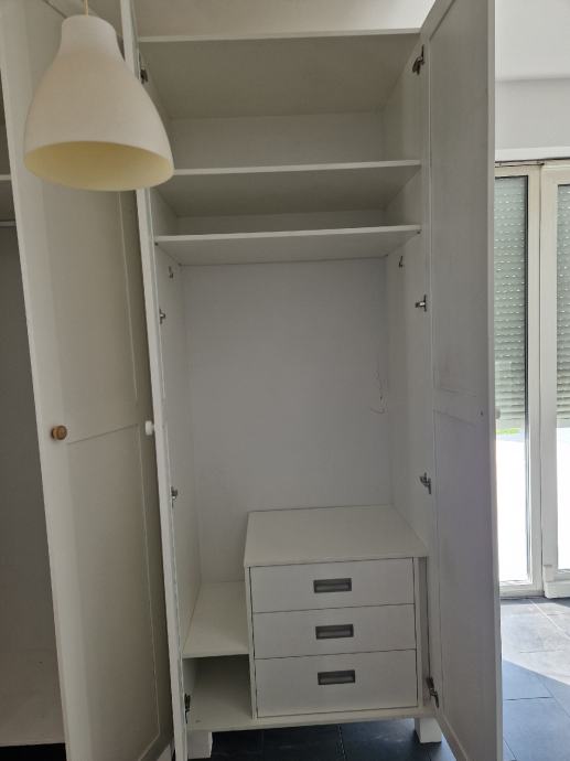 Tijelo ormara je modularno, police iz lijevog se mogu izvaditi ( ili presložiti po potrebi, rupe su izbušene) ladičar i dvije police iz desnog se mogu izvaditi kao što se vidi na fotografijama. Ormar se ne koristi i provizorno je sklopljen za fotografiranje, pantovi se daju poštelavati što sada nismo radili pa vrata uz malo poštelavanja savršeno sjedaju.