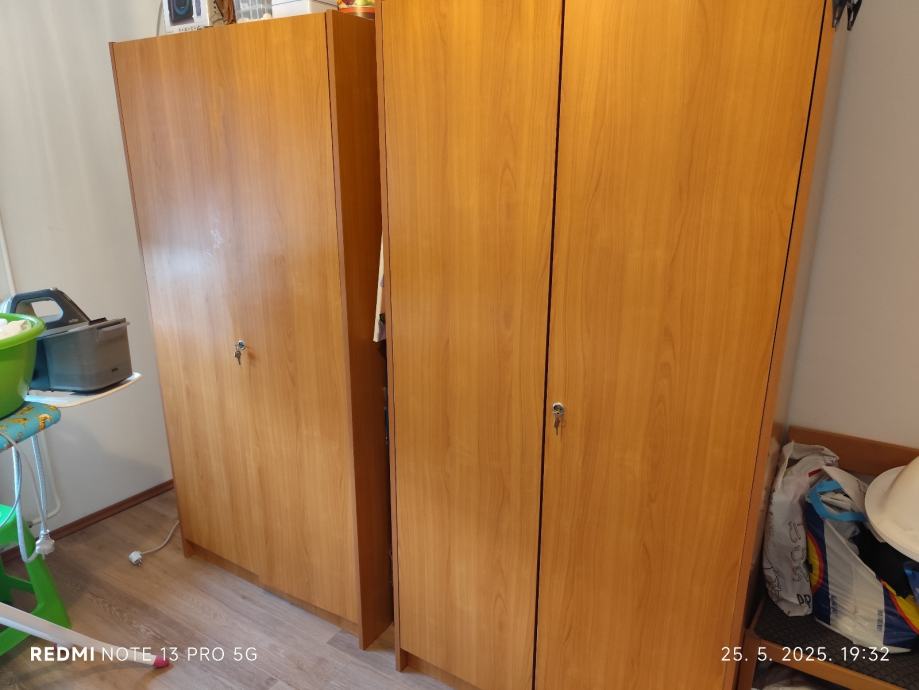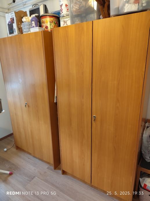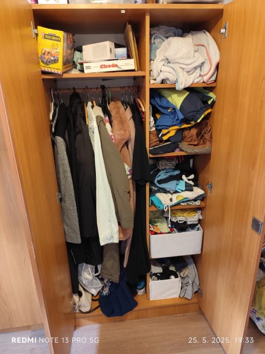 Klasični dvokrilni ormar. Pola ormara su vješalice a pola police. Boja hrast.